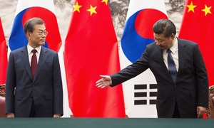 South Korean photographers protested after security personnel stopped them from following Moon's delegation.
