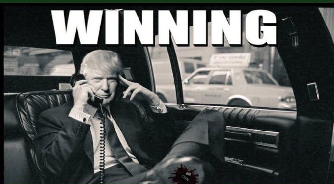 Trump in the back of a car with the crushed CNN logo on the sole of his left shoe. The image had additional text superimposed on it that read, “WINNING”.